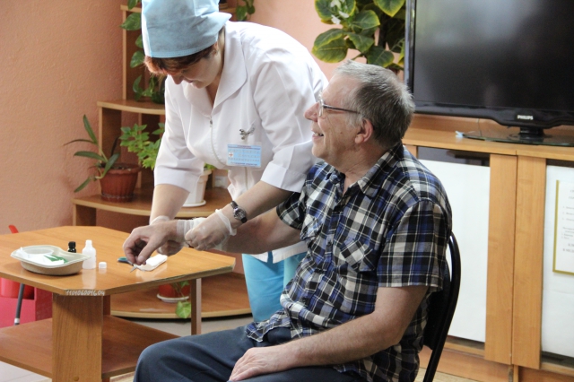 Затем медицинский работник рассказал и продемонстрировал на практике основные правила оказания первой доврачебной помощи при порезах, ушибах и растяжениях. Жители дома-интерната вспомнили, как правильно обработать и наложить бинт на рану в зависимости от места и степени повреждения, а также как наложить и зафиксировать лангет.