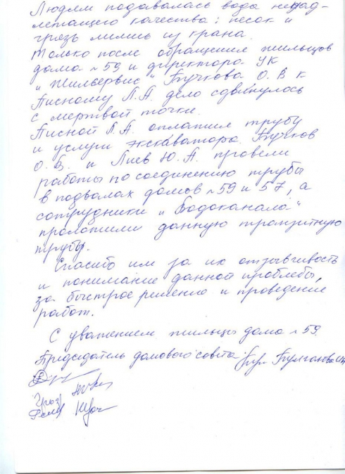 Не один год жильцы мучились с подачей воды, т.к. транзитная труба пришла в негодность, вся в чопиках. Людям подавалась вода ненадлежащего качества: песок и грязь лились из крана. Только после обращения жильцов №59 и директора УК «Жилсервис» Бучкова О.В к Писному Л.А. дело сдвинулось с мертвой точки.