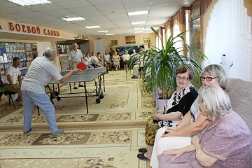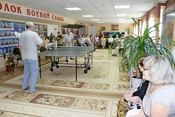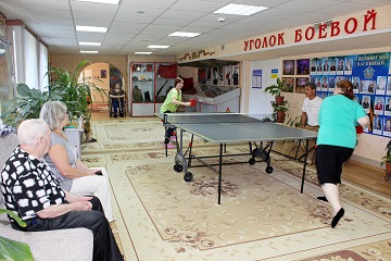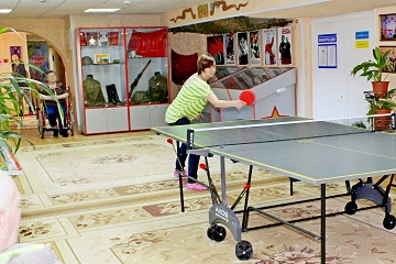 Настольный теннис пользуется большой популярностью у подопечных Энгльсского дома-интерната. Регулярно здесь проходят занятия под руководством опытного инструктора. И ежедневно до самого позднего вечера проживающие ведут уже самостоятельные теннисные баталии. Ведь теннисное оборудование здесь всегда доступно для дружеских турниров. Теннисный стол располагается в большом и самом уютном, по отзывам проживающих, холле учреждения. Здесь действительно есть на что посмотреть: мини-музей экспонатов времен Великой Отечественной, огромный аквариум с экзотическими рыбками, выставки творческих работ проживающих, - всё это центральный холл.