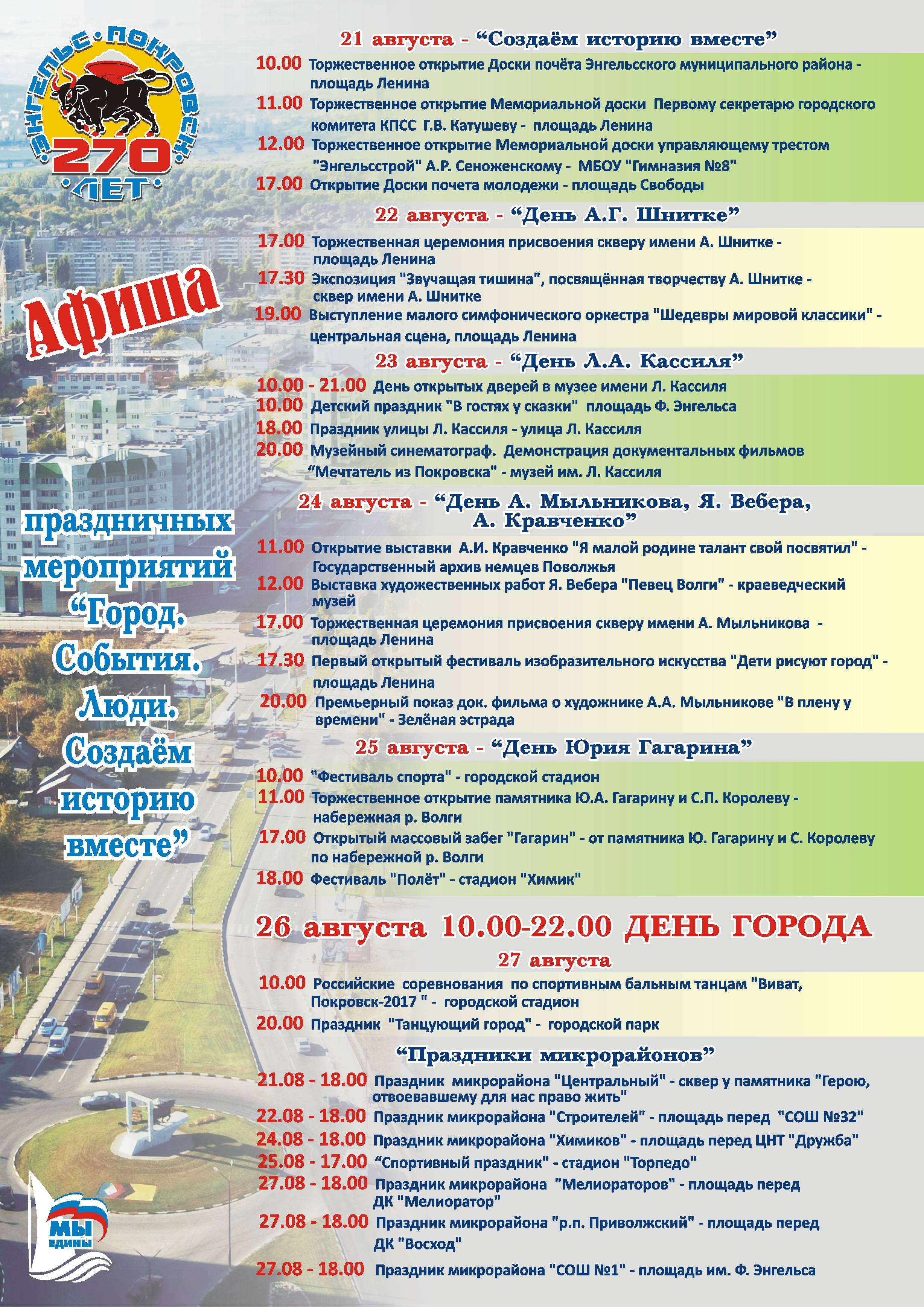 В понедельник в Энгельсе стартовали мероприятия праздничной недели, посвященной 270-летия со дня основания Покровска- Энгельса.