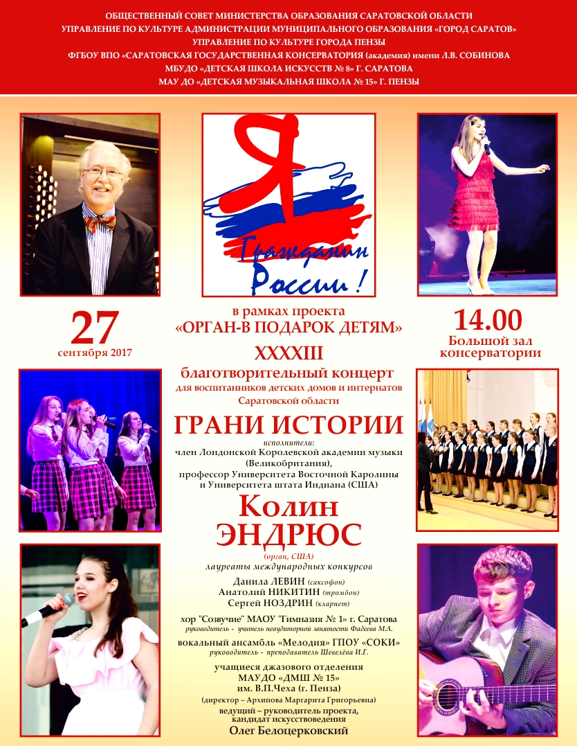 27 сентября 2017 года в 14.00 в Большом зале Саратовской консерватории для воспитанников детских домов и интернатов Саратовской области состоится XXXXIII благотворительный концерт «Грани Истории» проекта школы искусств № 8 «Орган – в подарок детям». В ансамбле с членом Лондонской Королевской академии музыки, профессором Университета Восточной Каролины и Университета штата Индиана Колином Эндрюсом выступят учащиеся джазового отделения ДМШ № 15 имени Виктора Чеха из Пензы, хор «Созвучие» Гимназии № 1, вокальный ансамбль «Мелодия» Саратовского областного колледжа искусств, джазовое трио клуба «Арлекин» под руководством Сергея Ноздрина. Впервые в проекте саратовской школы искусств № 8 выступит прославленный Губернский театр хоровой музыки. На концерте будут присутствовать более 50 директоров средних общеобразовательных школ Саратовской области. В ходе заседания Общественного совета Министерства образования области художественный руководитель театра хоровой музыки, заслуженный деятель искусств РФ Людмила Алексеевна Лицова будет награждена медалью «за большую просветительскую деятельность» Председателем совета Саратовским Сергеем Владимировичем.