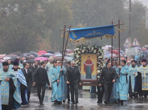Сегодня, 14 октября, в Энгельсе в честь праздника Покрова Пресвятой Богородицы, который считается именинами города, прошел традиционный крестный ход. Сотни верующих прошли по улицам города от храма Покрова Божией Матери до Свято-Троицкого кафедрального собора под проливным дождем.