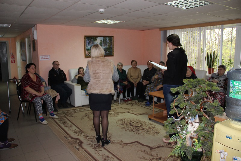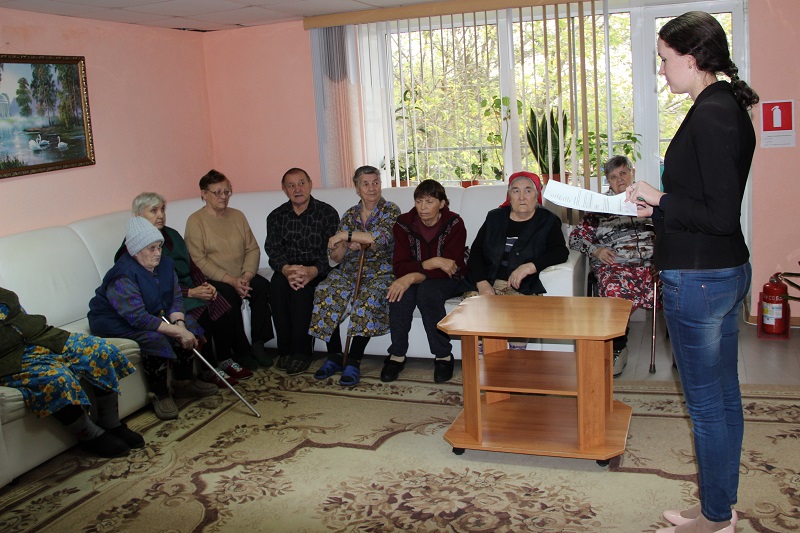 Затем жители дома-интерната узнали о перечне факторов помогающих избавиться или сократить до минимума влияние метеочувствительности. Это нормализация сна, прогулки на свежем воздухе и физическая активность. Также значимым фактором выступает рацион питания, исключающий в дни магнитных бурь: острую и жирную пищу, а также черный чай и кофе. И необходимость включения в рацион питания продуктов содержащих витамин С (шиповник, облепиха, апельсин, лук, смородина и др.), и продуктов богатых калием (бананы, курага, изюм, и др.).