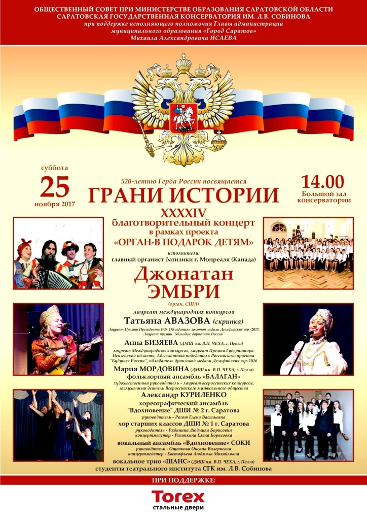 25 ноября в 14.00 в Большом зале консерватории состоится 44й благотворительный концерт «Грани Истории» Проекта ДШИ № 8 «Орган – в подарок детям» для воспитанников детских домов и интернатов области. Данное мероприятие будет посвящено 520-й годовщине утверждения символа России – Государственного герба Российской Федерации. В ансамбле с американским органистом Дж. Эмбри выступят лучшие пензенские молодые певцы - лауреат Международных конкурсов, лауреат Премии Губернатора Пензенской области, Абсолютный победитель Российского проекта "Будущее России", обладатель бронзовой медали Дельфийских игр-2016 Мария МОРДОВИНА и Лауреат Премии Президента России, Обладатель Золотой медали Дельфийских игр-2017, Лауреат премии «Молодые дарования России»Анна БИЗЯЕВА, фольклорный ансамбль «БАЛАГАН» под руководством Александра КУРИЛЕНКО, хореографический ансамбль"Вдохновение", сводный хор школы искусств № 1, вокальный ансамбль колледжа искусств, трио «ШАНС» и студенты театрального института СГК им. Л.В. Собинова. Для участия в престижном проекте приедет делегация лучших учащихся школ искусств г. Пензы и начальник управления по культуре г. Пензы В.А. Фейгина. Организует концерт Общественный совет Министерства образования области. Более 10 лет шефствует над проектом исполняющий полномочия Главы администрации МО «Город Саратов» М.А. Исаев. Ведущий концерта - руководитель Проекта, кандидат искусствоведения Олег Белоцерковский. Спонсор Проекта – ООО «ТОРЭКС».