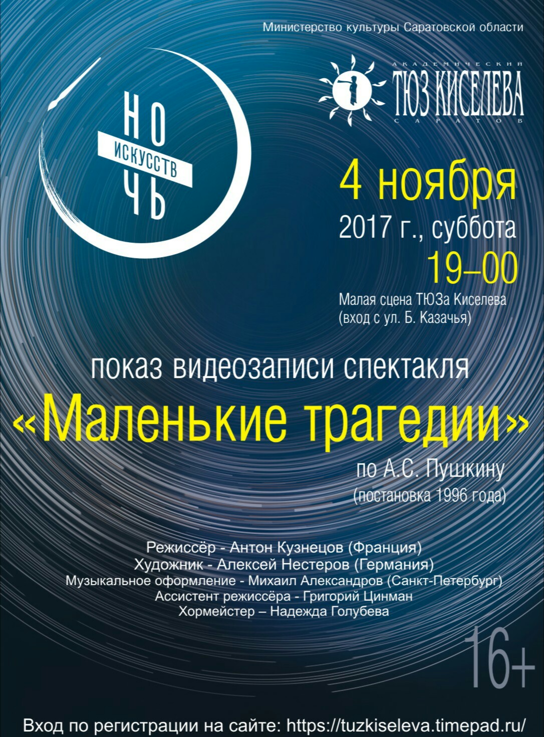 В субботу 4 ноября ТЮЗ уже в третий раз присоединится к всероссийской культурно-образовательной акции «Ночь искусств»с полюбившимся поклонникам театра форматом — показом видеозаписи архивного спектакля на Малой сцене. Героями прошлых акций были постановки Юрия Петровича Киселёва «Женитьба Белугина» и «Кабанчик», в 2017 году зрителей приглашают на показ легендарного спектакля «Маленькие трагедии» по А.С. Пушкину (постановка 1996 года). Режиссёр этого спектакля — заслуженный артист России Антон Кузнецов, художественный руководитель Саратовского театра драмы в 1998-2005 годах, в последние годы он жил и работал во Франции (его не стало очень рано, в 45 лет в 2013 году). Спектакль, над которым Антон Кузнецов работал вместе с художником Алексеем Нестеровым и автором музыкального оформления Михаилом Александровым стал для ТЮЗа Киселёва этапным. В нём были заняты ведущие актёры театра — Григорий Цинман (выступивший также в роли ассистента режиссёра), Александр Соловьёв, Александр Фёдоров, Илья Володарский, Сергей Пускепалис, Ольга Кутина, Татьяна Лукина, Елена Вовненко, Сергей Стёпин, Тамара Цихан. Постановку предваряет пролог — «Сцена из Фауста», написанная А.С. Пушкиным за 6 лет до «Маленьких трагедий».
