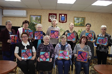 Мероприятие проходило в читальном зале первого корпуса учреждения, где собрались самые творческие и активные проживающие. Вела мастер-класс Лидия Николаевна Толченникова – талантливая энгельсская поэтесса и художник, уже признанный мастер, работающий в технике «шерстяная акварель». Для первой картины она предложила участникам довольно простой сюжет «Бабочка в небе». Прекрасное насекомое создавали при помощи ярких волокон непряденой шерсти. Ведущая давала подробные инструкции, в мельчайших подробностях рассказывала и демонстрировала все секреты мастерства. И хотя все участники использовали одни и те же материалы и приемы, в результате появились работы совсем не похожие друг на друга. Необычный материал для живописи – натуральная шерсть – создал эффект объема и какой-то особенной «живости» и теплоты изображения.
