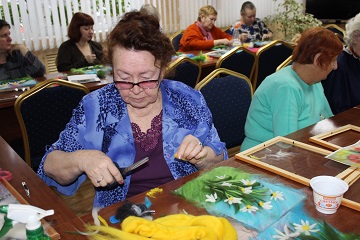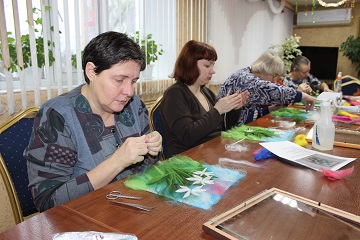 В читальном зале первого корпуса собрались проживающие дома-интерната, которые к тому времени успели уже неплохо овладеть техникой создания картин из шерсти. Ведущая мастер-класса Лидия Николаевна Толченникова предложила участникам в качестве образца картину «Букет из ромашек и васильков» и подробно объяснила все этапы работы. Но некоторые из участниц решили проявить фантазию и воплотить собственные идеи. В результате, даже у тех, кто четко следовал указаниям мастера, получились совершенно уникальные картины, не похожие друг на друга.