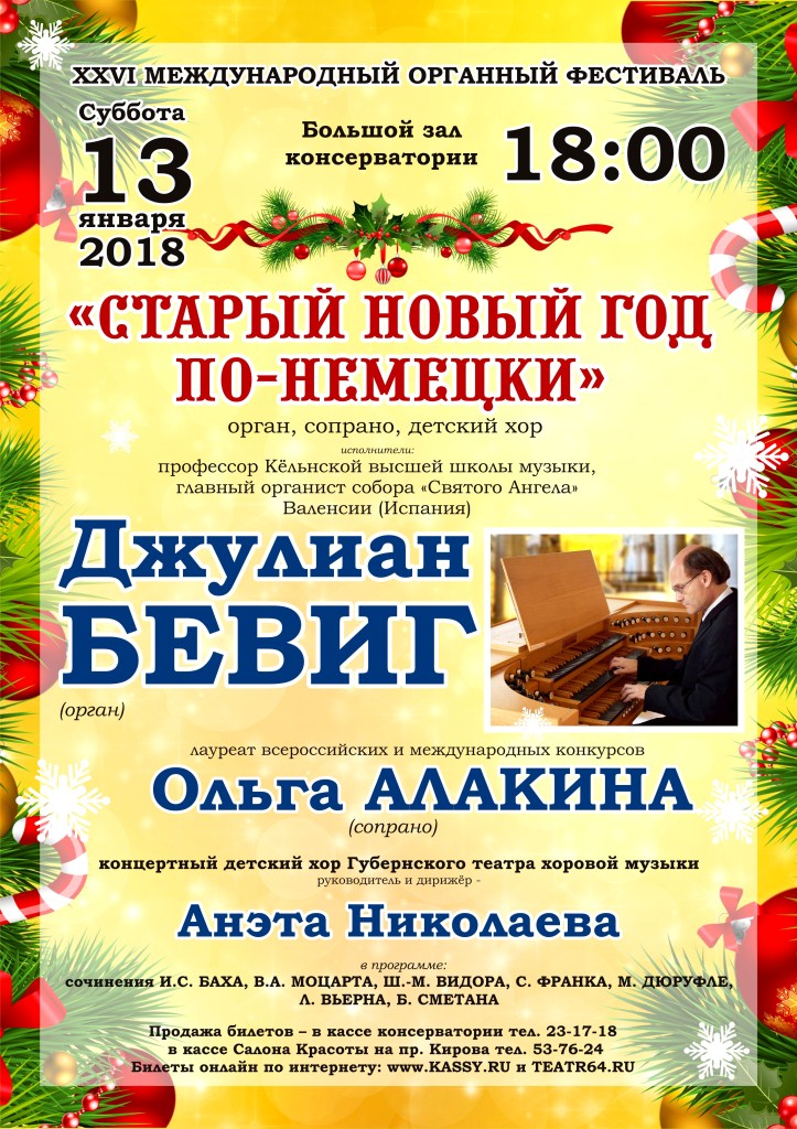 13 января 2018на 26м Международном органном фестивале состоится большой новогодний праздничный концерт «Старый новый год по-немецки» с участием немецкого органиста Джулиана Бевига, оперного сопрано Ольги Алакиной и «ангельских голосов» - Концертного детского хора Губернского театра хоровой музыки.