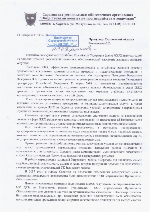 Кировского района ООО УО «Жилкомплекс» Челышев Владимир Алексеевич пристроен на должность заместителя директорапо коммерческой деятельности МУП «Водосток». Скажите, он что столь незаменимый коммунальный чиновник, без которого администрация МО «Город Саратов» не может никак обойтись? Кто пролоббировал это его назначение на эта должность? Жители Кировского района Саратова прекрасно помнять делишки этого персонажа на посту директора ООО УО «Жилкомплекс», которую он совмещал с руководством МУ ДЕЗ по Кировскому району – передача в управление в эту созданную коммерческую структуру без проведения муниципальных конкурсов при помощи доверенности , выданной прежним главой администрации А.А. Сундеевым, начисление корректировок оплат за ЖКУ, отсутствие нормального содержания и ремонта жилых домов, попустительство деятельности этой компании уже в должности заместителя главы администрации района, банкротство этой компании и перевод жилых домов в другие коммунальные компании с директорами и учредителями бывших директоров и начальников ЭУ ООО УО «Жилкомплекс»! Скажите, почему все причастные к созданию и деятельности на территории Заводского района Саратова подельники беглого мэра Прокопенко за подобные делишки привлечены к реальной уголовной ответственности , а бывшие коммунальные деятели Кировского района города продолжают спокойно находиться на пенсии, занимать должности в администрации города и муниципальном предприятии? Когда они будут освобождены от должностей и привлечены к уголовной отвественности?