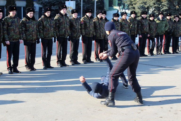 Для ребят был организован показ специальной техники в сопровождении лекции об оснащенности и технических возможностях транспортных средств. Сотрудники полиции продемонстрировали кадетам выполнение боевых приемов борьбы.