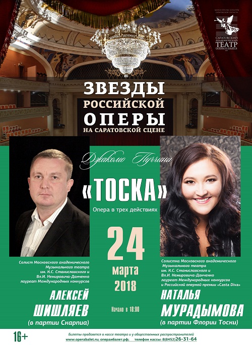Близится к финалу успевший полюбиться саратовскому зрителю проект «Звезды российской оперы на саратовской сцене». 24 марта в заключительном спектакле проекта опере «Тоска» Дж. Пуччини нас ждет встреча с солистами Московского академического Музыкального театра им. К. С. Станиславского и Вл. И. Немировича-Данченко Натальей Мурадымовой (Флория Тоска) и Алексеем Шишляевым (Скарпиа).