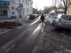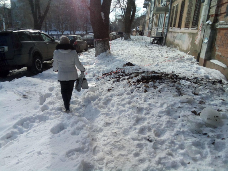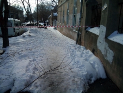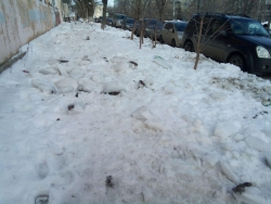 «Зима прошла, весной решили почистить все-таки крыши. Представьте себе объемы снега, который там скопился за все время. Вот все это вывалили на тротуар и на этом успокоились. Для красоты повесили ленточки красные. Там пройти теперь невозможно – весь тротуар в ледовых валунах. И это в центре города, напротив здания министерства образования. Там же школа рядом, детей как водить? Обходить все это безобразие приходится по проезжей части, где тоже не чистили всю зиму и теперь лишь две колеи для машин», - рассказал Александр.