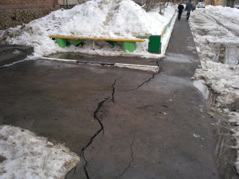 Но увы, ничего не изменилось. Пришла весна - а во дворе вода, и лопнувший асфальт.