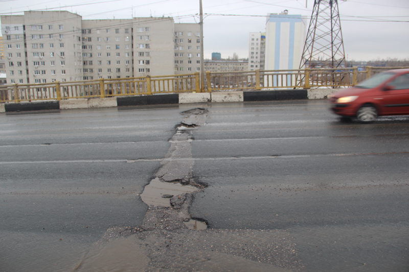 Он находится, можно сказать, на въезде в город и, являясь его воротами, постоянно загружен многочисленным автотранспортом. Передвигаться по нему можно по четырем полосам, по две в каждую сторону. Точнее, так по нему можно было бы передвигаться, если бы не многочисленные дефекты на деформационных швах. Некоторые выбоины настолько глубоки и широки, что проехать и не угодить в яму просто невозможно. Кое-как можно передвигаться по средним полосам, а вот по крайним болезненные попадания в ямы гарантированы. Разбиваются диски, пробиваются колеса, летят колпаки, громко отдается в кузов попавшее на скорости в западню колесо. Иные разрушения настолько глубоки, что вовремя их заметивший водитель останавливается прямо посреди моста, собирая затор, и ждёт, пока появится возможность объехать препятствие по соседней полосе. Даже аккуратное сползание в яму не гарантирует, что из неё выберешься без повреждений. Можно только представить, сколько саратовцев и посетителей нашего города «гостеприимно» повстречал этот мост - настоящий убийца подвески. Фантазия сразу рисует астрономические издержки городской казны на компенсации, обращайся каждый угодивший в выбоину в суд...