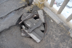 Удивляет, что на таком самом по себе опасном объекте до сих пор не навели порядок, хотя следить должны в первую очередь. Не уступает дороге и пешеходная часть сооружения. Бетонные плиты на ней либо провалились, либо растворились, обнажив арматуру. Здесь пройдёт не каждый здоровый человек, а уж об инвалиде-колясочнике и говорить не приходится.