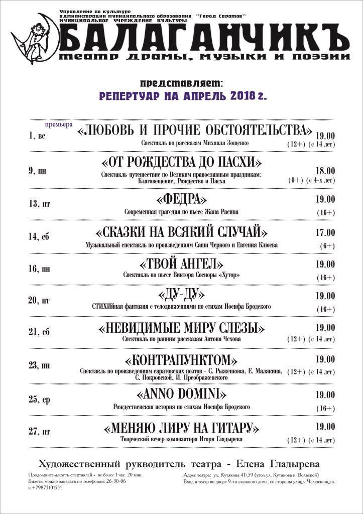 Репертуар театра "Балаганчикъ" на апрель 2018