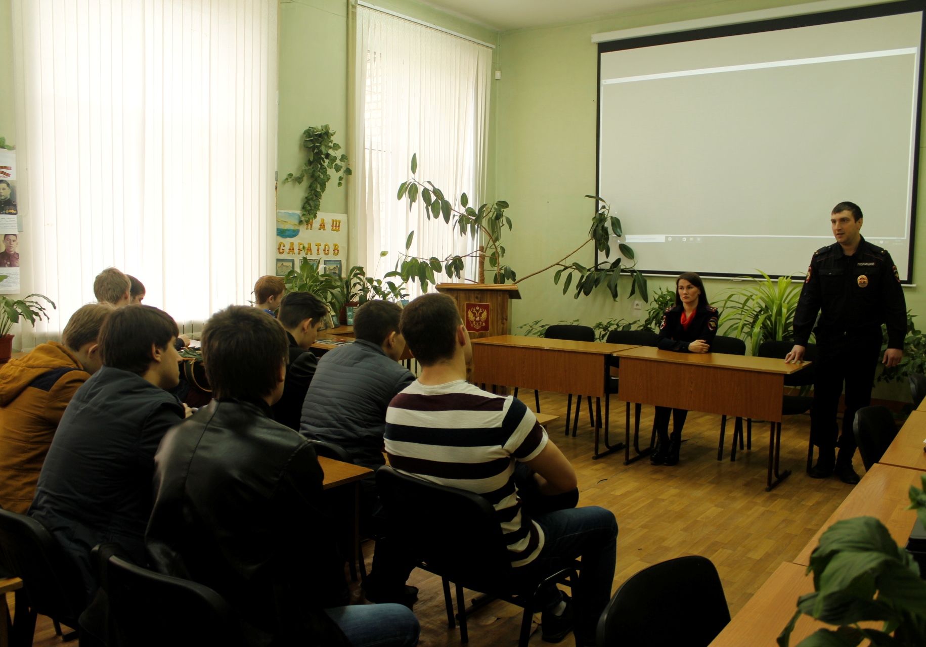 Акция проходила в стенах «Геологического колледжа СГУ им. Н.Г. Чернышевского». Инспекторы по пропаганде совместно с участковым уполномоченным отдела полиции № 7 познакомили студентов со спецификой своей работы, осветили моменты ежедневной работы, приводили примеры отдельных случаев из своей служебной деятельности, таких как, розыск и задержание преступников, выявление административных правонарушений и уголовных преступлений, установление и погоня за нетрезвым водителем, выезд на место ДТП с пострадавшими, а также спасение инспекторами детей из горящего дома.