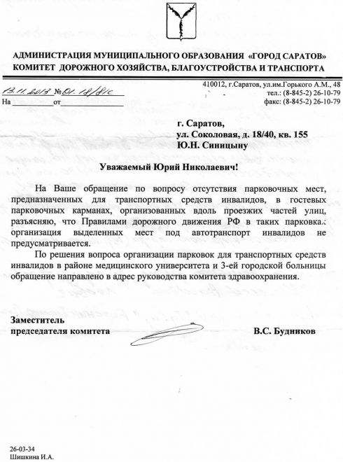 Здравствуйте, Олег Васильевич ! Высылаю Вам для ознакомления один из образцов шедевров рукописного и умственного творчества чиновников администрации. Только Вы можете помочь инвалидам с парковкой их автомашин в городе, создать для них среду, в которой не будет барьеров. Олег Васильевич , в Законе № 181-ФЗ 1995 г. в ред.от 02.07.2013 "О социальной защите инвалидов в РФ" ст.15 сказано, что" На каждой стоянке (остановке) автотранспортных средств, в том числе также обязательно и около предприятий торговли, сферы услуг, медицинских, спортивных и культурно-зрелищных учреждений, выделяется не менее 10 процентов мест (но не менее одного места) для парковки специальных автотранспортных средств инвалидов, которые не должны занимать иные транспортные средства. Инвалиды пользуются местами для парковки специальных автотранспортных средств бесплатно". Прошу Вашего содействия и помощи в обеспечении выполнения администрацией города совместно с ГИБДД данных статей закона в городе Саратове, т.к. мест для инвалидов на стоянках нигде не найти по всему городу. В частности у театра оперы и балета места инвалидов заняты работниками ССПриставов, Росреестра, Управления кадастра и другими здоровенными лицами. Для получения пенсии около Сберкассы № 19 ( на Горького 43 у театра) хоть бы разрешили инвалидам останавливаться. Куда податься инвалиду? Ранее, года 3-4 назад, Вы в соответствии с № 181-ФЗ в городе навели порядок. Сегодня многие руководители опять забыли этот Закон. Прошу помочь . Успехов Вам! С уважением Юрий Николаевич Синицын