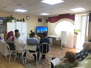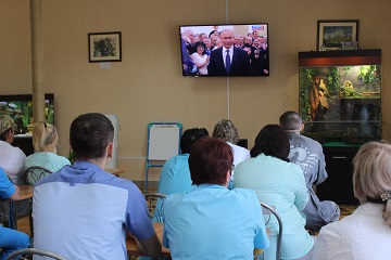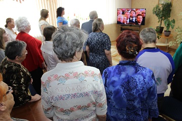 Телезрители комфортно разместились в большом читальном зале учреждения, в холлах жилых отделений и собственных комнатах. Под первые звуки государственного гимна все встали со своих мест, подпевали, не отрывая глаз от телевизора.