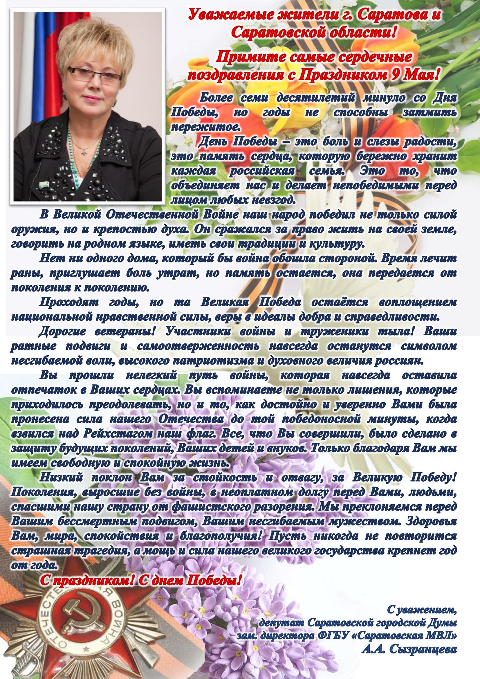 Депутат гордумы Александра Сызранцева поздравляет саратовцев с Днем Победы
