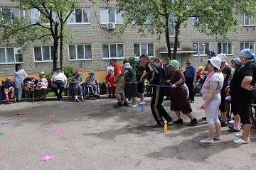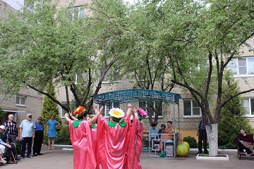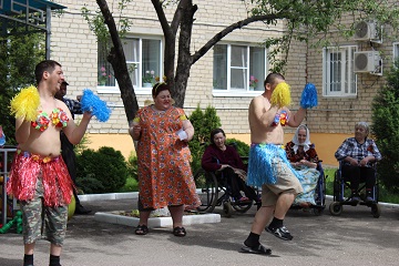 Мероприятие прошло на открытой территории учреждения. Здесь комфортно разместились жильцы всех возрастов. И вот началось праздничное действо, состоящее из забавных конкурсов, эстафет и интеллектуальных заданий. В этот день зрители также стали активными участниками программы. Во время музыкальных пауз выступали местные таланты: пели, танцевали, читали стихи. Покорил зрителей шуточный гавайский танец в исполнении двух юношей-жильцов.