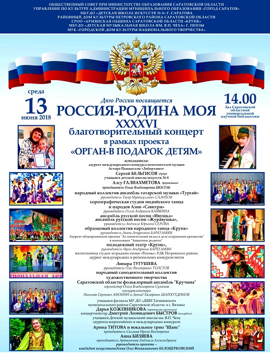 13 июня в 14.00 в концертном зале Саратовской областной универсальной научной библиотеки состоится праздничный концерт «Россия- Родина моя» в рамках проекта Детской школы искусств № 8 «Орган – в подарок детям» для воспитанников детских домов и интернатов области, учащихся коррекционных школ. При поддержке Общественного Совета Министерства образования Саратовской области, Армянской общины Саратовской области «Крунк» и Управления по культуре г. Пензы руководителю проекта, кандидату искусствоведения Белоцерковскому О.В. удалось собрать в честь празднования Дня России на одной сцене ведущие творческие коллективы и солистов из г. Сочи, Пензенской и Саратовской областей.