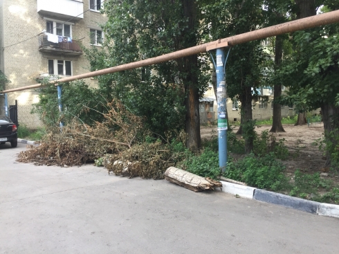 Деревья спилить спилили, а мусор, обрубки, ветки, полена, убрать не удосужились. Прошу Вас обязать УК вывезти мусор и вернуть ограждения, развороченные их службами,на место.