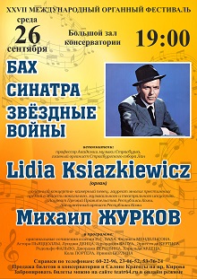 26 сентября на открытии 27го Международного органного фестиваля в Саратове состоится выступление профессора Академии музыки Страсбурга, главного органиста большого органа собора Лан в столице французской провинции Эльзаса Лидии Ксяшкевич(Франция) и любимого саратовской публикойоперного, концертно-камерного певца, лауреата многих престижных премий в области вокального, музыкального и театрального искусства, Лауреата Премий Правительства Республики Коми, Заслуженного артиста Республики Коми Михаил Журкова (лирический баритон). Программа "Бах, Синатра, Звёздные войны" объединит классику, джаз, сальсу, песни из репертуара Френка Синатры и музыку к фильму "Звёздные войны".