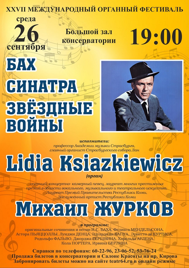 Несмотря близость дат выступлений, Михаил остался верен «своим» зрителям и исполнит прощальный концерт в Саратове буквально накануне ответственной Чебоксарской премьеры – 26 сентября в Большом зале Саратовской консерватории. Его концерт в ансамбле с европейской «звездой» - профессором Академии музыки Страсбурга, главным органистом большого органа собора Лан французской провинции Эльзаса Лидией Ксяшкевич - откроет 27й Международный органный фестиваль. Программа "Бах, Синатра, Звёздные войны" объединит классику органа И.С. Баха, Ф. Мендельсона, танго Астора Пьяццоллы, джаз Чика Кореа и музыку из сериала «Звёздные войны». В дуэте с Михаилом Журковым французская органистка исполнит популярные неаполитанские песни, песни Харольда Арлена, Джорджа Гершвина, Кола Портера из репертуара Фрэнка Синатры.