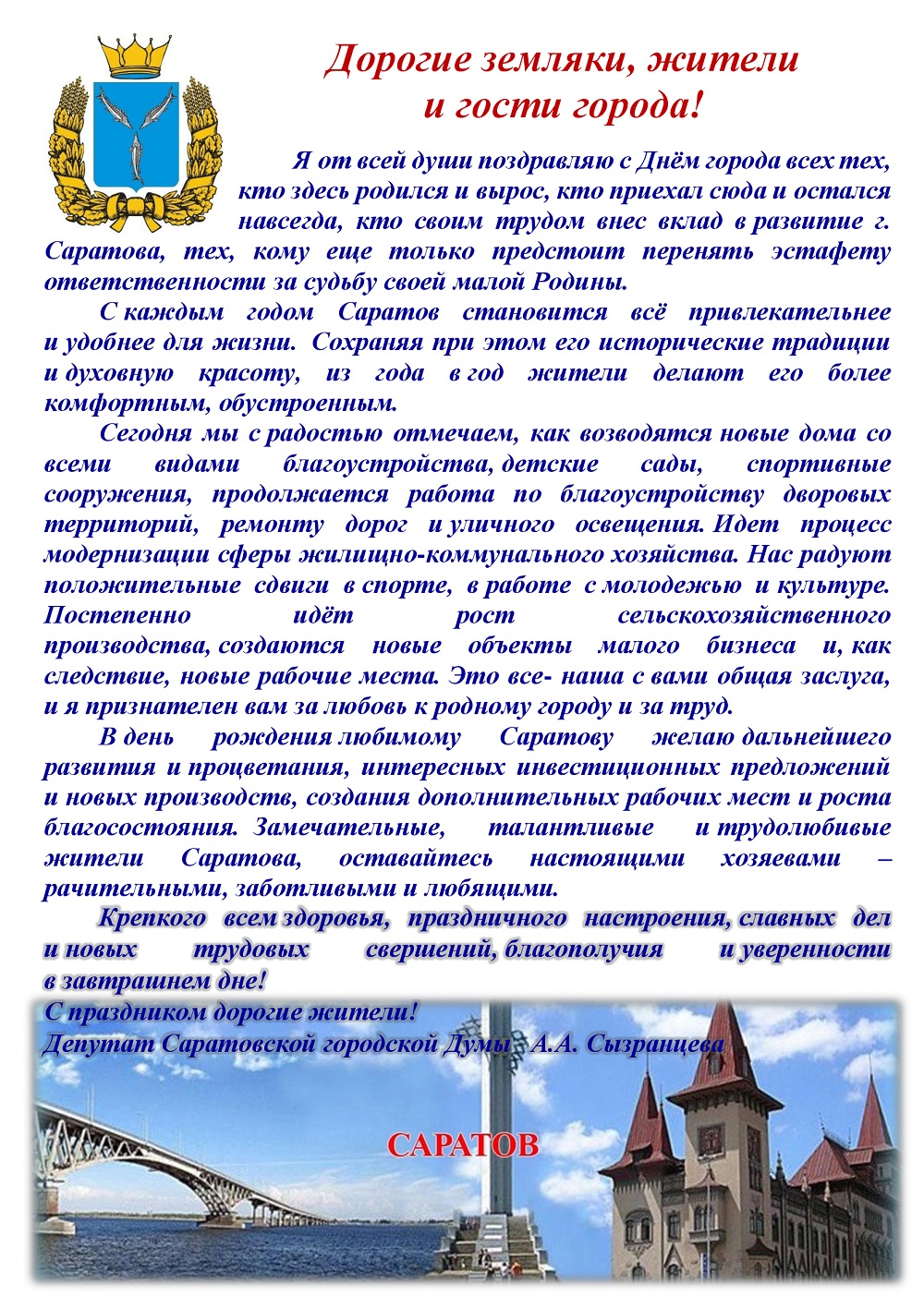 Депутат Александра Сызранцева поздравляет саратовцев с Днем города