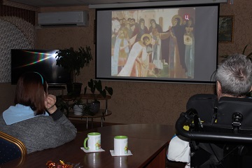Трансляция фильма прошла и в комнатах маломобильных жильцов дома-интерната. По традиции ведущими кинопоказов и собеседниками участников проекта стали волонтеры православного молодежного общества «Покров».