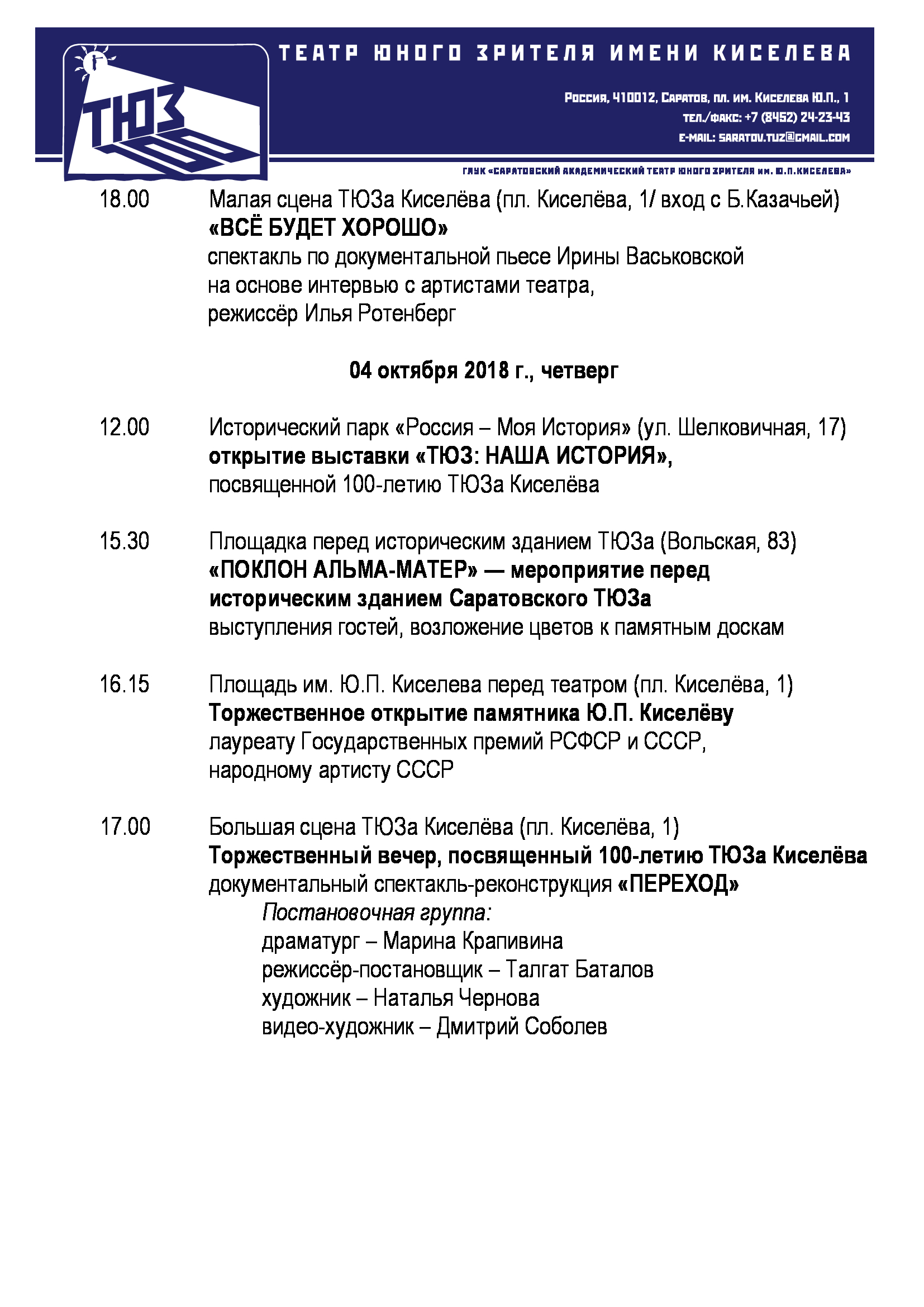Программа празднования 100-летия саратовского ТЮЗа в рамках Театрального форума-фестиваля "Век детства"