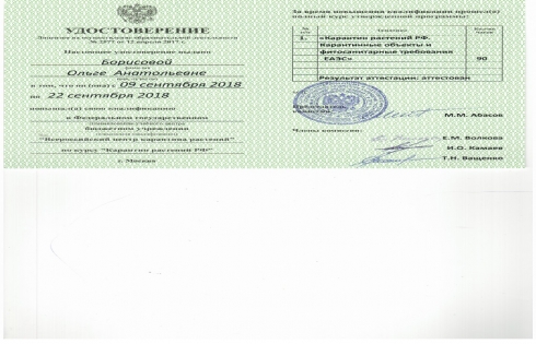 Специалисты в области карантина растений ФГБУ «Саратовская МВЛ» с 09 по 22 сентября 2018 года прошли полный курс повышения квалификации по теме «Карантин растений РФ. Карантинные объекты и фитосанитарные требования ЕАЭС» (на базе ФГБУ «ВНИИКР»). Специалистам за время прохождения полного курса утвержденной программы было выдано Удостоверение с результатом аттестации: аттестован.