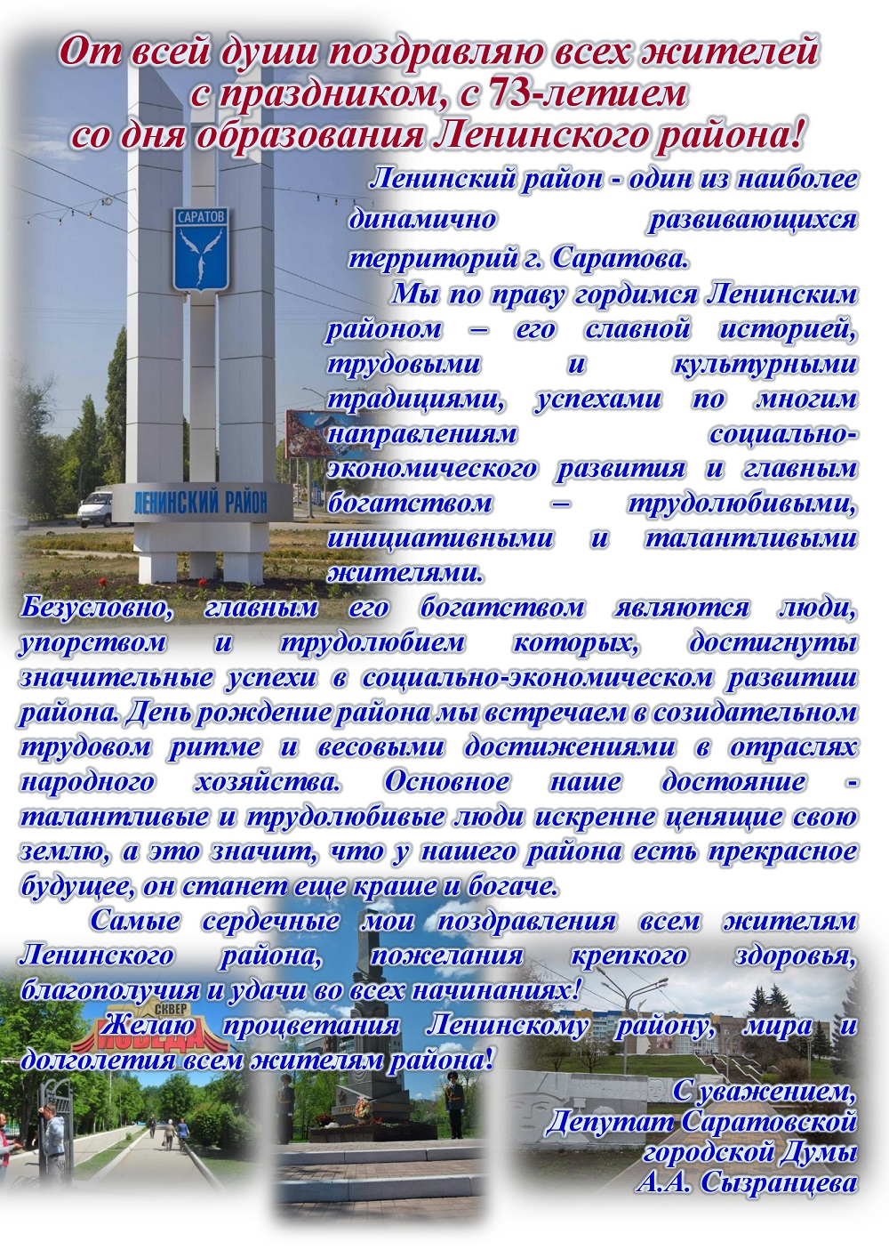 Депутат Александра Сызранцева поздравляет жителей с 73-летием Ленинского района