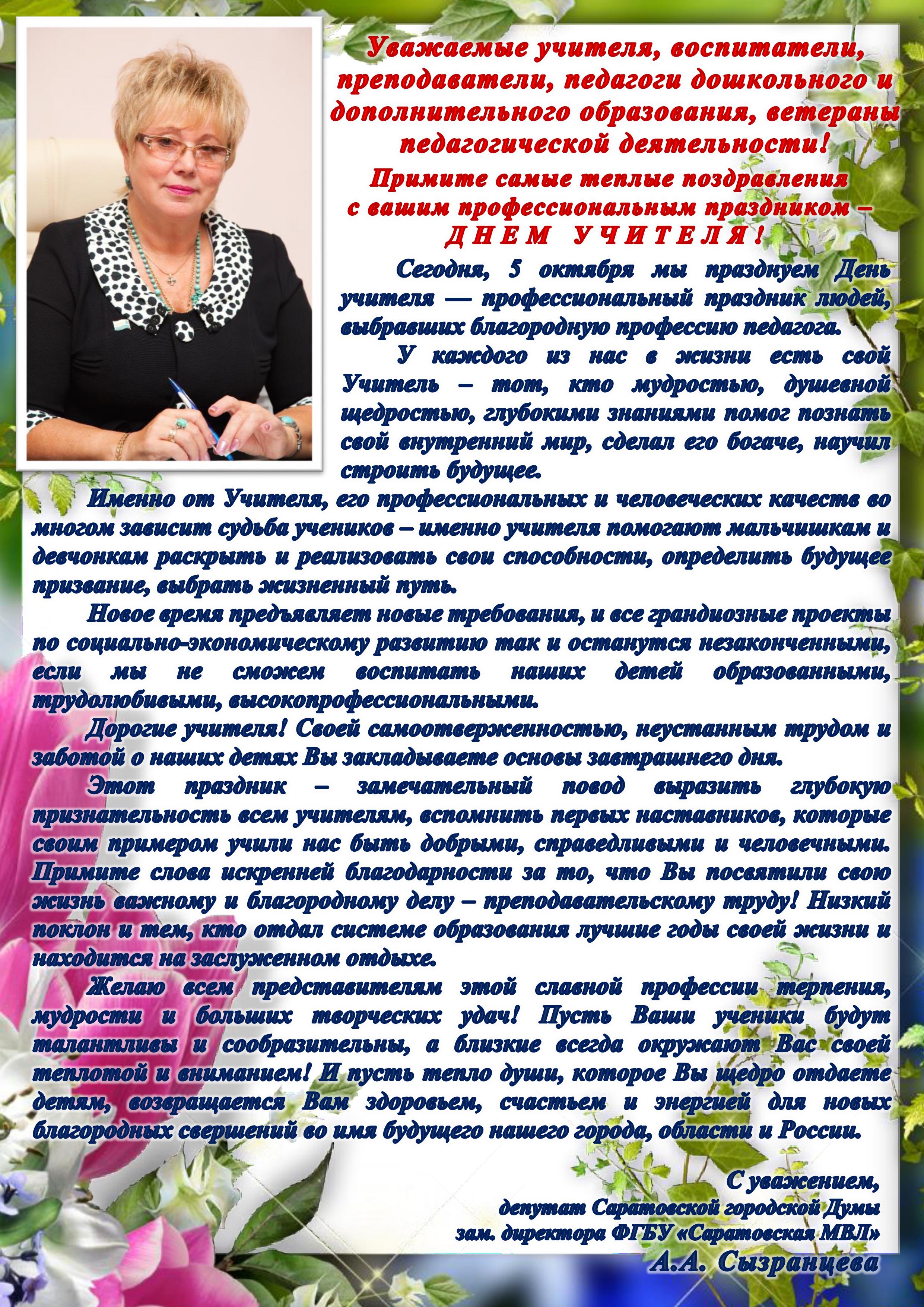 Депутат Александра Сызранцева поздравляет учителей, педагогов и дошкольных работников с профессиональным праздником