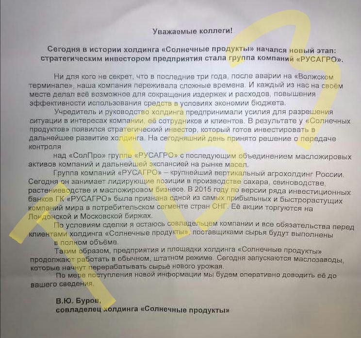 В обращении к сотрудникам отмечается, что принято решение о передаче «Русагро» контроля над «Солнечными продуктами», а в дальнейшем планируются объединение активов и экспансия на масложировом рынке.