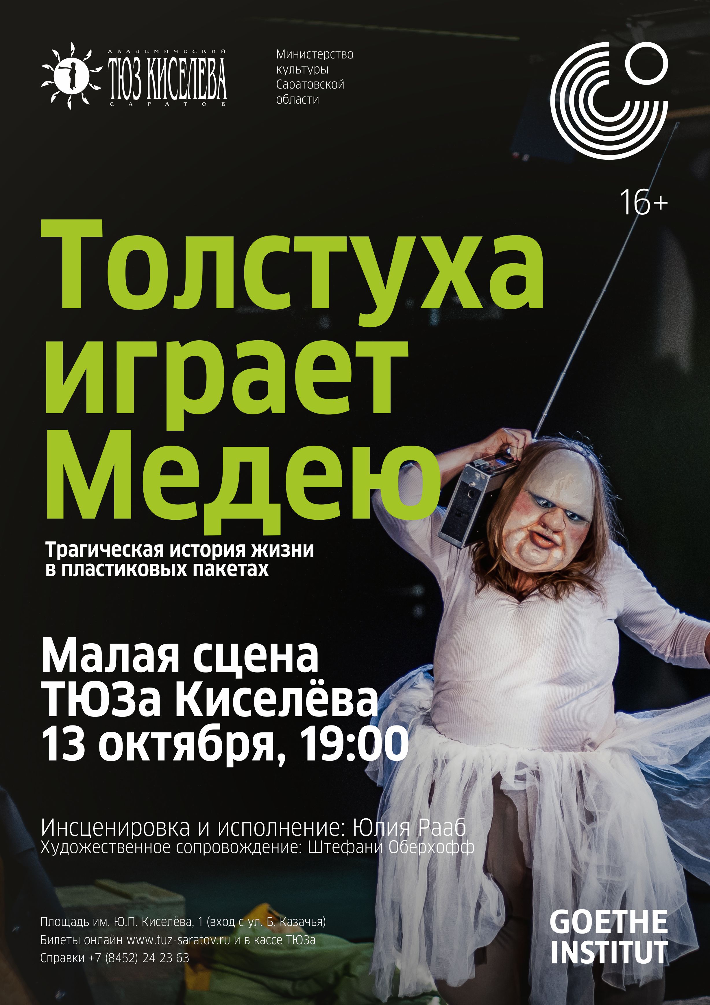 13 октября 2018 года, в субботу, в 19-00 на Малой сцене ТЮЗа Киселёва пройдет единственный показ моноспектакля немецкой актрисы и театрального педагога Юлии Рааб «Толстуха играет Медею». Юлия Рааб родом из города Халле-ан-дер-Заале, она окончила Высшую школы музыки и сценического искусства в Штутгарте, участница многих немецких и международных театральных фестивалей.