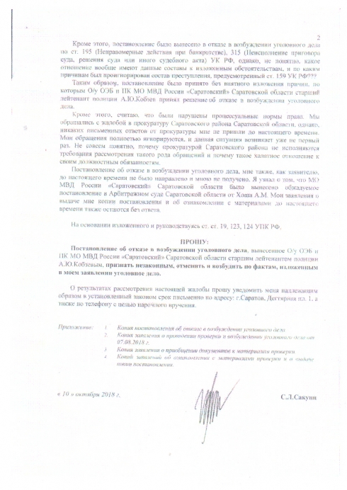 Даже постановление об отказе в возбуждении уголовного дела мне не выдают и не направляют по почте… Я узнал о том, что вынесено такое постановление от лица, в отношении которого просил провести проверку в ходе рассмотрения иска в Арбитражном суде Саратовской области по делу № А57-7052/2018.