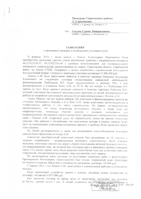 У нас с Хошом А.М., Рыбаловым В.Р. и Рыбаловым Д.В. были устные договоренности, что совместными усилиями мы создаем два коттеджных поселка и делим прибыль от их продажи. Однако, после того, как я вложил более 16 млн.руб., осуществлял строительство и иные работы в общем деле, данные лица путем совместного сговора решили меня исключить из общего дела, лишить меня и вложенных денежных средств, и земельных участков, и прибыли.
