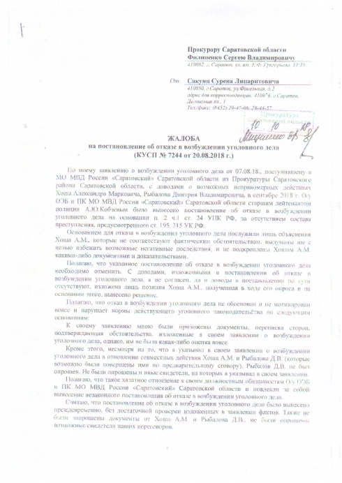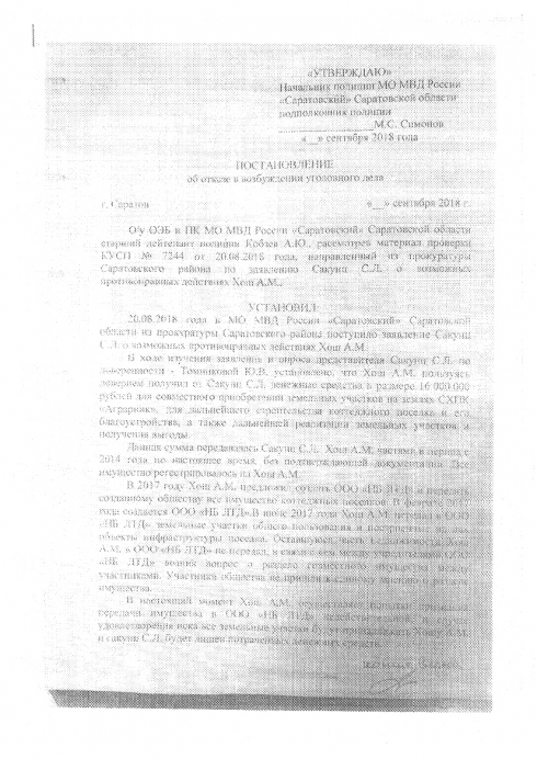 По моим заявлениям выносят постановления об отказе в возбуждении уголовного дела, даже не вникая в суть противоправных действий. Не исследуются обстоятельства нарушений, не допрашиваются лица, на которых я указываю, как лиц, которые могут подтвердить мои доводы. Не исследуются представленные мною письменные доказательства. Проводят опрос одного Хоша А.М. и только на основании его опроса, делают вывод, что состава преступления о мошенничестве нет.