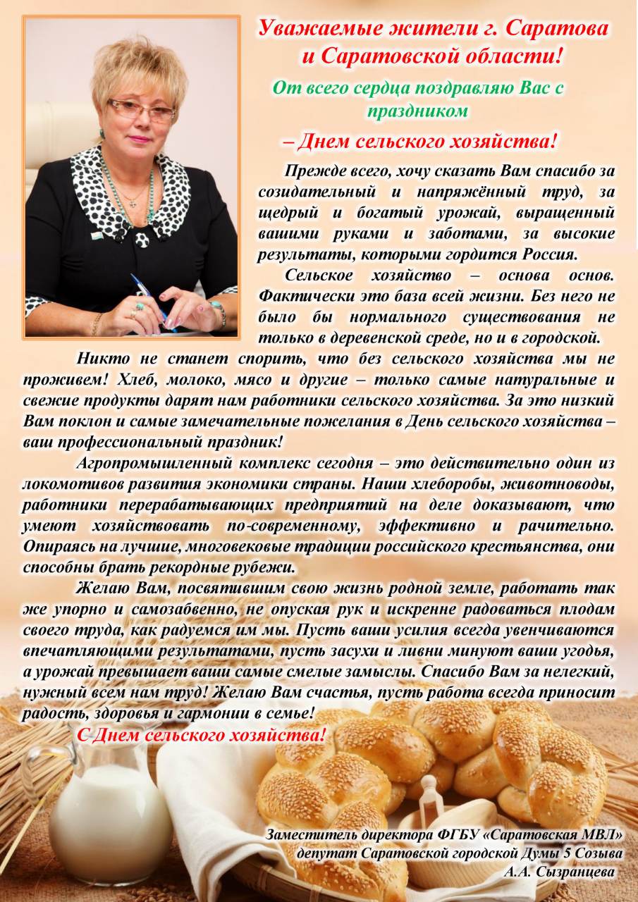 Депутат Александра Сызрацева поздравляет саратовцев с Днем сельского хозяйства
