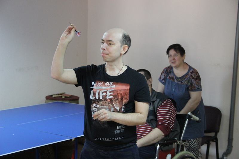 В этот раз жители дома-интерната играли в «Раунд». Цель данного вида игры — выбить по порядку цифры до пяти. Участники обучали друг друга, подсказывали новичкам правильную технику броска.