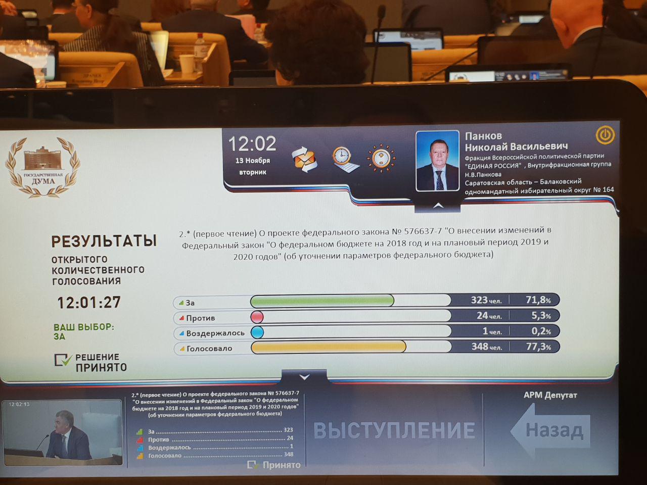 Государственная Дума приняла сегодня в первом чтении поправки в федеральный бюджет. Об этом рассказал депутат Госдумы Николай Панков в своем телеграм-канале «Пара слов».