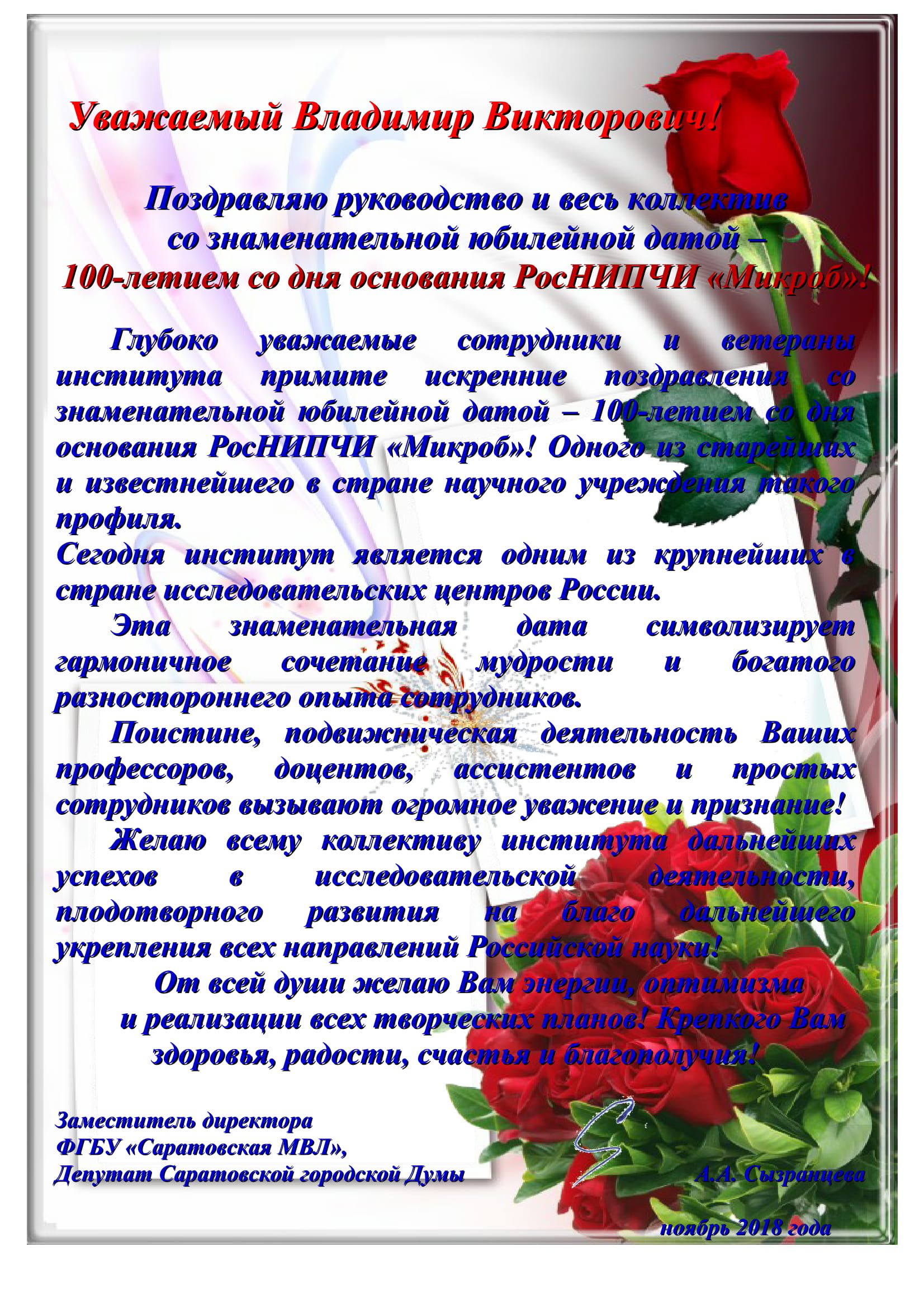 Депутат гордумы Александра Сызранцева поздравляет руководство и коллектив института "Микроб" с Юбилеем