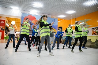 В продолжение мероприятия отряд ЮИД МОУ «СОШ №18» организовали яркий уличный флешмоб в светоотражающих жилетах для наглядной демонстрации световозвращающих элементов. Несмотря на прохладную погоду, юных танцоров и волонтёров пришли поддержать родители и друзья. Посетители торгового центра и прохожие, также не остались равнодушными к исполнителям танца, а самые маленькие зрители, присоединились к участникам танцевального флешмоба, вооружившись светоотражающими элементами от сотрудников ГИБДД.