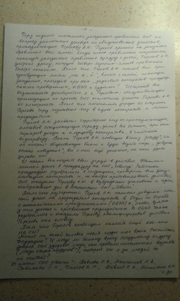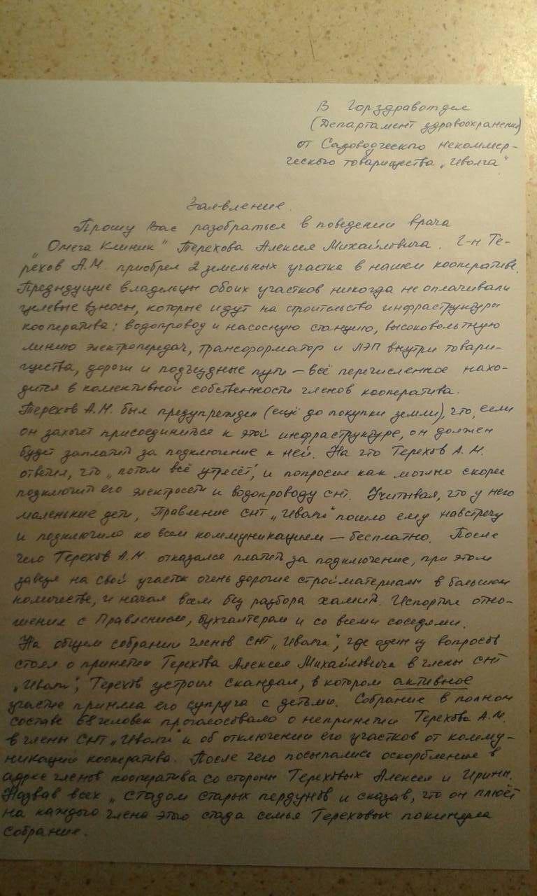 Прошу Вас разобраться в поведении врача «Омега Клиник» Терехова Алексея Михайловича. Г-н Терехов А.М. приобрел 2 земельных участка в нашем кооперативе. Предыдущие владельцы обоих участков никогда не оплачивали целевые взносы, которые идут на строительство инфраструктуры кооператива: водопровод и насосную станцию, высоковольтную линию электропередач, трансформатор и ЛЭП внутри товарищества, дороги и подъездные пути-все перечисленное находится в коллективной собственности членов кооператива. Терехов А.М. был предупрежден (еще до покупки земли), что, если он захочет присоединиться к этой инфраструктуре, он должен будет заплатить за подключение к ней. На что Терехов А.М. ответил, что «потом все утрясет, и попросил как можно скорее подключить его электросети и водопроводу СНТ. Учитывая, что у него маленькие дети, Правление СНТ «Иволга» пошло ему навстречу и подключило ко всем коммуникациям-бесплатно. После чего Терехов А.М. отказался платить за подключение, при этом завозил на свой участок очень дорогие стройматериалы в большом количестве, и начал всем без разбора хамить. Испортил отношения с Правлением, бухгалтером и со всеми соседями. На общем собрании членов СНТ «Иволга», где один из вопрос стоял о принятии Терехова Алексея Михайловича в члены СНТ «Иволга», Терехов устроил скандал, в котором активное участие приняла его супруга с детьми. Собрание в полном составе 68 человек проголосовало о неприятии Терехова А.М. в члены СНТ «Иволга» и об отключении его участков от коммуникации кооператива. После чего посыпались оскорбления в адрес членов кооператива со стороны Терехова Алексея и Ирины. Назвав всех «стадом старых пердунов и сказав, что он плюет на каждого члена этого стада» семья Тереховых покинула собрание. Через неделю состоялось заседание правления СНТ по вопросу заключения договора на обслуживание участков, принадлежащих Терехову А.М. Терехов пришел на заседания Правления всей семьей. Когда члены правления попросили покинуть заседание правления супругу и детей, Терехов А.М. устроил драку, которую четверо мужчин-членов правления быстро погасили. После чего Терехов А.М. послав всех присутствующих матом «на х…й», вместе с семьей покинул заседание, пригрозив при этом «задолбать кооператив прокуроскими проверками, ОБЭП и судами». Исчерпав все возможности договориться с г. Тереховым; обслуживающая организация по просьбе СНТ отключила участок Терехова А.М. от электросети. После чего посыпались угрозы со стороны Терехова через подставленных лиц в адрес кооператива и лично председателю.