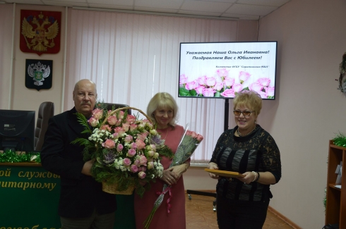 Руководство и коллектив ФГБУ «Саратовская МВЛ» тепло поздравили с юбилеем, а также за добросовестный труд и успехи в профессиональной деятельности заместителя директора по диагностической работе учреждения Ольгу Ивановну Позднякову.