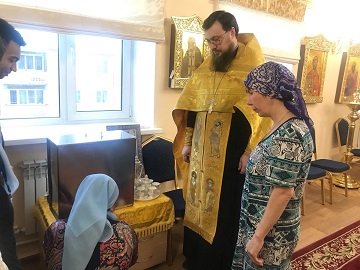 Проживающие, не имеющие возможность передвигаться, тоже не остались без внимания. Сотрудники дома-интерната вместе с отцом Андреем разнесли святую воду по комнатам всем верующим. Батюшка побеседовал с прихожанами и напомнил, как использовать святую воду. Что пить ее следует для укрепления души и тела, особенно в болезни. Если человек по какой-то причине не в состоянии выпить воду, можно умыть ею лицо. Прощаясь, святой отец пожелал всем здоровья и крепости духа.