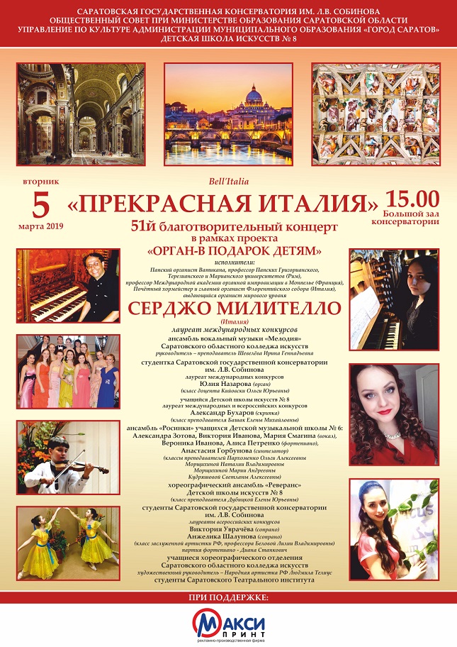 3 марта он прилетит в Саратов со священником Римско-католической церкви Андреа Джусто. По предложению художественного руководителя Саратовского фестиваля, кандидата искусствоведения Олега Белоцерковского Серджо выступит на только что установленном и освящённом новом органе в г. Марксе. Встречать ивестного музыканта будет и настоятель Церкви Христа Царя о. Боско Маршнер – первого католического храма, возведённого в России после 1917 года. 4 марта Серджо примет участие в подготовке 51го благотворительного концерта «Bella Italia» проекта Саратовской консерватории, Общественного Совета Министерства образования и Детской школы искусств № 8 «Орган – в подарок детям». 5 марта Серджио выступит в двух концертах – для детей-сирот области и на 27м Саратовском органном фестивале с редкоисполняемыми сочинениями И.С. Баха и его сыновей. Серджио входит в десятку самых именитых музыкантов мира.