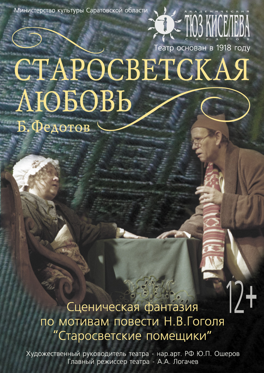 В основе спектакля «Старосветская любовь» лежит пьеса артиста, поэта и драматурга Бориса Федотова по мотивам повести Н.В. Гоголя «Старосветские помещики», поставили его режиссер Александр Петров и художник-постановщик — заслуженный художник РФ Владимир Фирер из Санкт Петербурга. Над музыкальным оформлением спектакля работали саратовский композитор Сергей Ткачев и хормейстер театра Надежда Голубева.